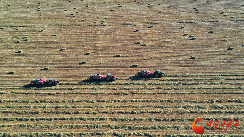11月9日,甘肅山丹馬場(chǎng)正在對(duì)此前收割晾曬的21萬(wàn)畝燕麥草打包運(yùn)輸,一輛輛大型農(nóng)用機(jī)械穿梭田間忙碌作業(yè)。
