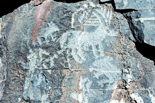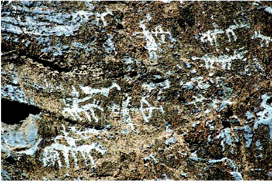 肅北縣大黑溝巖畫是全國重點(diǎn)文物保護(hù)單位,巖畫形成時(shí)間初步斷定在春秋、戰(zhàn)國至西漢時(shí)期,位于肅北縣城東約40公里處的大黑溝。巖畫共有34組,圖案190多幅,零亂分布在3.5公里長的山溝中,畫面內(nèi)容多為射獵、放牧、練武、乘馬作戰(zhàn)等場景和北山羊、野牛、野駱駝等動物,畫面表現(xiàn)形式多以凹刻和凸刻,巖畫大多刻在避風(fēng)向陽的陡峭花崗巖和石灰石上。