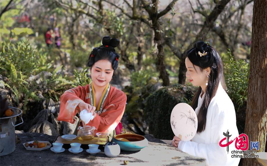 一朵梅花寓五福,一山梅花賀新春。梅原里,游客們或賞花祈福、或獨(dú)自品溫,或拍照打卡,盡情享受賞梅樂(lè)趣。還有不少游客,為了應(yīng)景,更是穿著古風(fēng)漢服或少數(shù)民族服飾,沉浸式打卡梅花節(jié),游客林女士說(shuō):“古裝配梅花,清麗脫俗,既感受到傳統(tǒng)文化之美,也為賞梅之旅增添了色彩。”