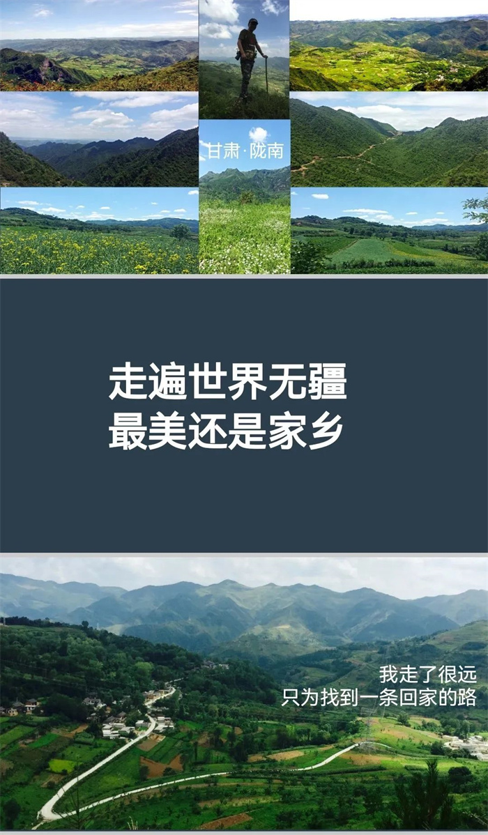 我每次回到西北各省區(qū)參加活動,做演講分享時,總會放幾頁PPT介紹我的家鄉(xiāng)——大隴南,配圖都是我拍攝的我們村莊附近的風光,也經常說一句話——“走遍世界無疆,最美還是家鄉(xiāng)”,不辭長作隴南人。