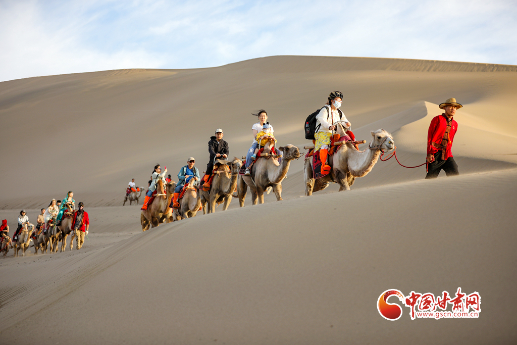 在甘肅敦煌鳴沙山月牙泉景區(qū),游客騎乘駱駝感受大漠風光。