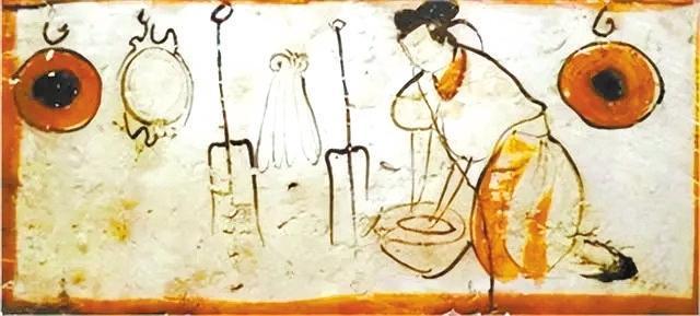 嘉峪關(guān)新城三號(hào)墓曾出土一塊畫像磚,圖為女子在盆中揉面,后面的墻上掛著鐺、箕等廚具。