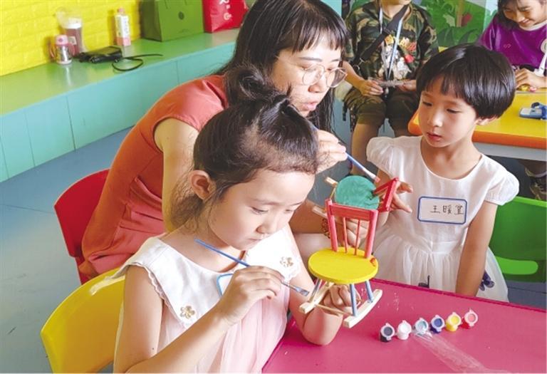為了讓孩子們切身體驗魯班的精湛技藝,在手工制作環(huán)節(jié),大家進行了榫卯結(jié)構(gòu)的椅子模型拼裝。在主持人的帶領(lǐng)指導(dǎo)下,孩子們將椅背、椅腿按照凹槽精準嵌入,并為其染上五彩底色、繪制精美圖案,一個個“小工匠們”便歡天喜地地完成了自己的手工作品。