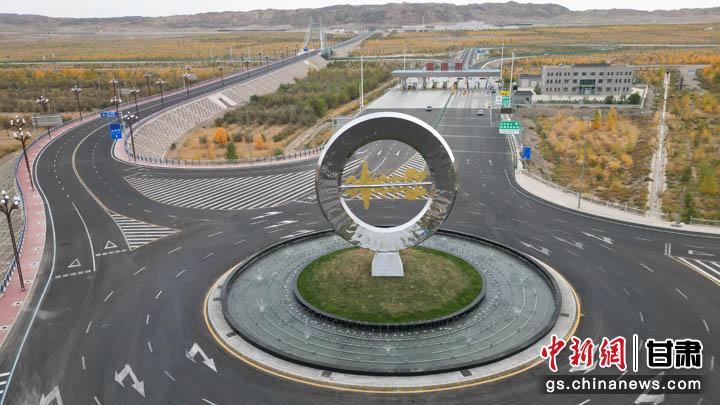圖為位于金塔南收費(fèi)站入口前,帶有胡楊和古佛塔元素的“天空之鏡”建筑。(無(wú)人機(jī)照片) 九美旦增 攝