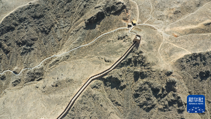 這是5月17日在甘肅省嘉峪關(guān)市拍攝的懸壁長(zhǎng)城(無(wú)人機(jī)照片)。新華社記者 陳斌 攝