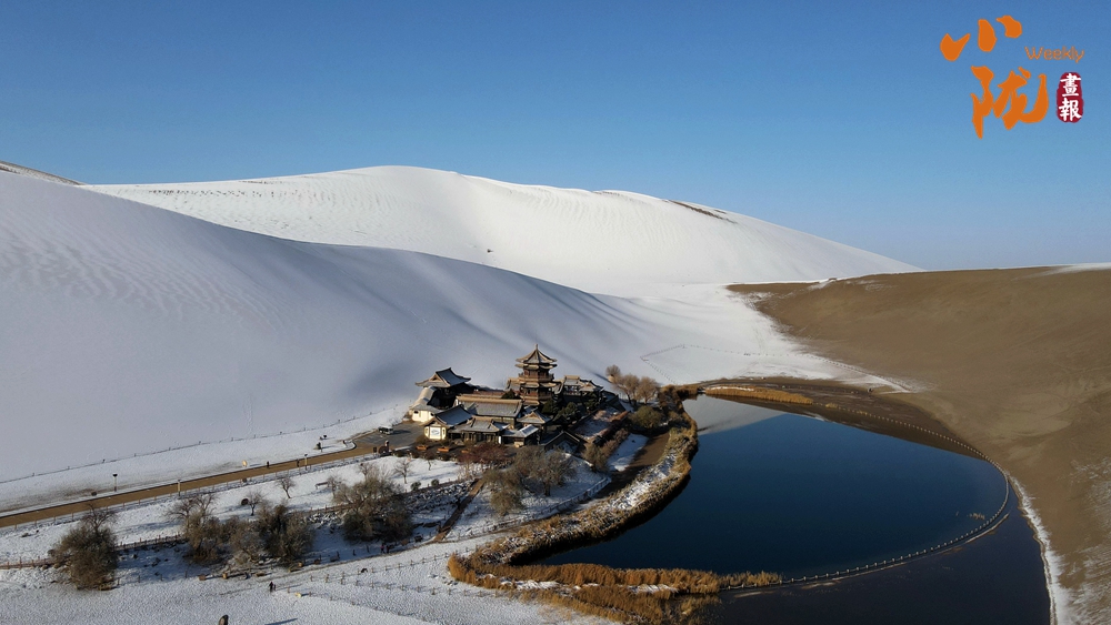 從空中俯瞰,漫漫沙漠覆蓋著白雪,月牙泉成了沙漠的眼睛,構(gòu)成另一幅美麗的沙海畫卷。