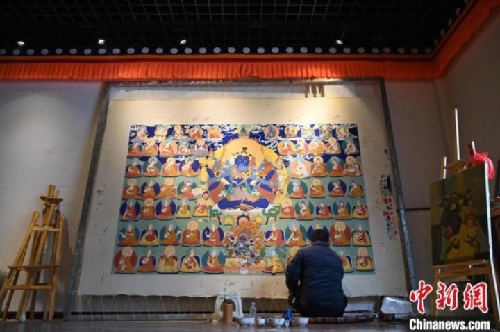 與外界慶祝節(jié)日的熱鬧“余溫”不同,25日,“世界藏學(xué)府”拉卜楞寺比鄰的唐卡小鎮(zhèn),一間畫(huà)室內(nèi)悄然無(wú)聲,唐卡師旦正嘉盤腿席地而坐,蘸取染料、勾線、上色,埋頭完成近整面墻高的巨幅唐卡。大大小小已完成的唐卡和各色顏料,填充了這所略大于教室的空曠房間。