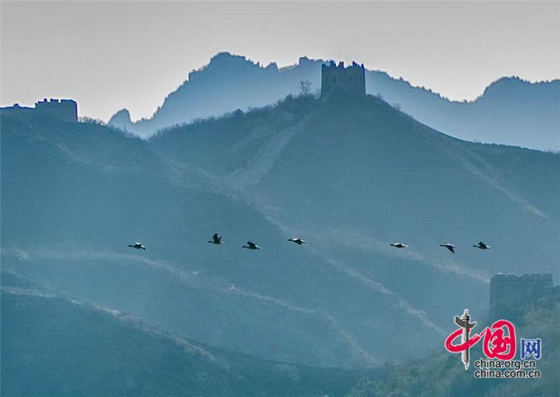 從南方遷徙飛翔越過(guò)金山嶺長(zhǎng)城后繼續(xù)北飛,