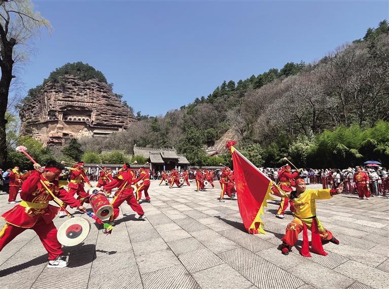 3月30日9時(shí),天水伏羲廟前人潮涌動,熱鬧非凡,來自蘭州的太平鼓隊(duì)以精彩絕倫的表演拉開蘭州助力天水麻辣燙文旅推廣活動大幕。