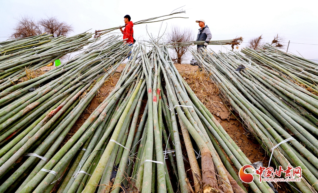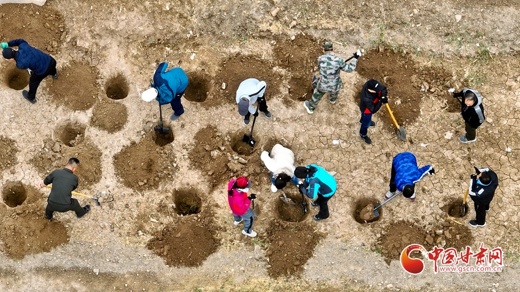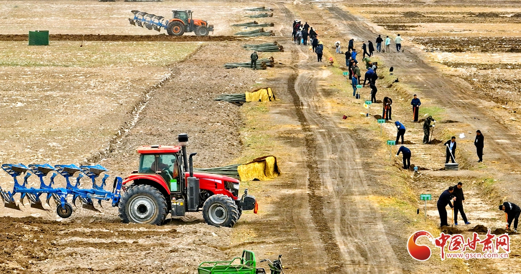 4月9日,甘肅省張掖市甘州區(qū)三閘鎮(zhèn)高寨村義務(wù)植樹基地上,千名當(dāng)?shù)馗刹柯毠ず椭驹刚邆儞]鍬鏟土挖樹坑,掀起農(nóng)田防護(hù)林建設(shè)和防沙治沙春季植樹造林熱潮。