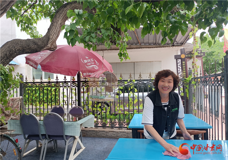 在梨園掩映中,上車村村民彭霞清家的小院安靜美好。進(jìn)入六月,梨園也進(jìn)入一年當(dāng)中生命力最旺盛的時(shí)節(jié),遮天蔽日的掩蓋讓這里成為蘭州人避暑的絕佳選擇,彭霞清也正在為即將到來的避暑旺季做準(zhǔn)備。