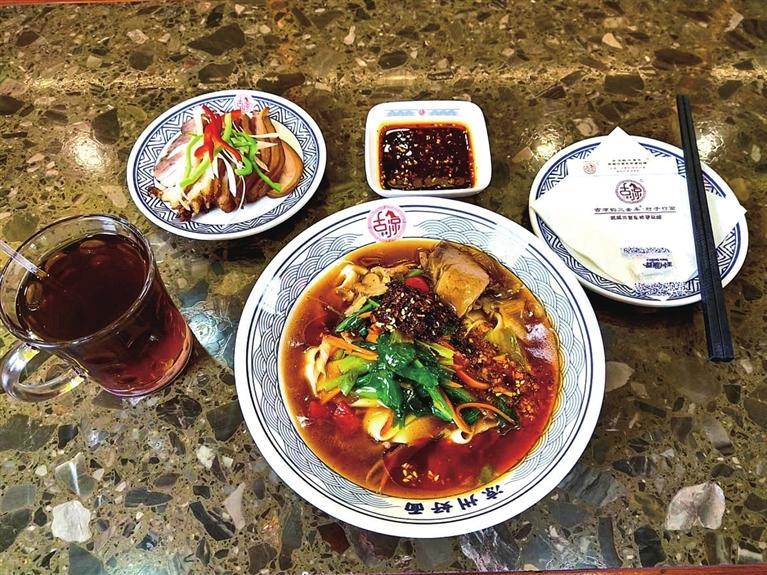 涼州,不僅有悠久的歷史、燦爛的文化,而且有回味無窮的美食。每天中午時(shí)分,位于雷臺綜合體的古凉韻“三套車”店里,食客絡(luò)繹不絕。從北京遠(yuǎn)道而來的程先生一行四人,特地前來打卡武威的這道特色美食。一碗行面、一盤鹵肉、一杯茯茶的組合,讓他們吃得津津有味。