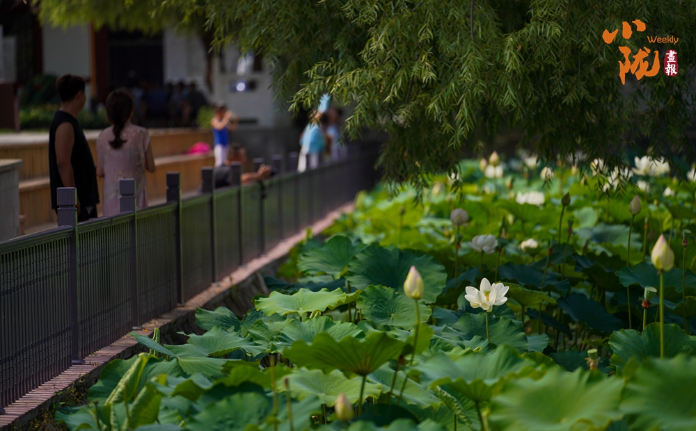 來(lái)到裴公湖放眼望去,在層層疊疊的荷葉間,盛開(kāi)的荷花隨風(fēng)輕擺、搖曳生姿,荷葉層層疊疊,荷香飄蕩,不少花蕾悄立枝頭,市民和游客漫步于荷塘步道,在清風(fēng)荷香間感受夏日韻味。