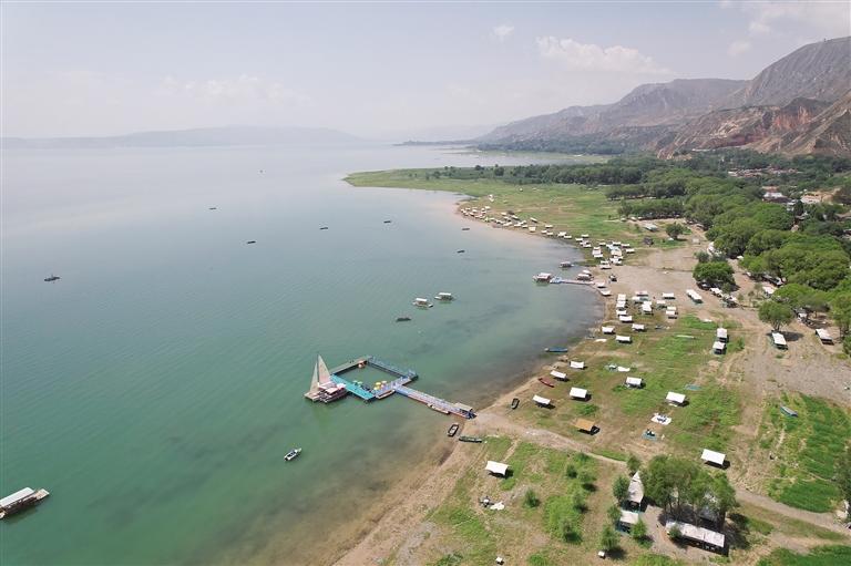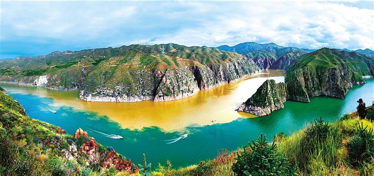 提及永靖劉家峽,第一反應(yīng)就是一個成語——“涇渭分明”。受上游降水影響,洮河河水比較渾濁,在與黃河交匯處劉家峽水庫的清波“相遇”時,形成一清一黃兩股水流,河流呈“Y”字形交匯。交融卻不滲透,加上河中的石山,猶如兩條巨龍游戲于此,在當?shù)剡@一景象也被稱為“二龍戲珠”。初秋時節(jié),來自全國各地的游客站在黃洮交匯觀景臺上,感受這份來自大自然的震撼與壯美,從高處遠眺入河口,“黃河清,洮河黃”,可謂“涇渭分明”,景色極為壯觀。