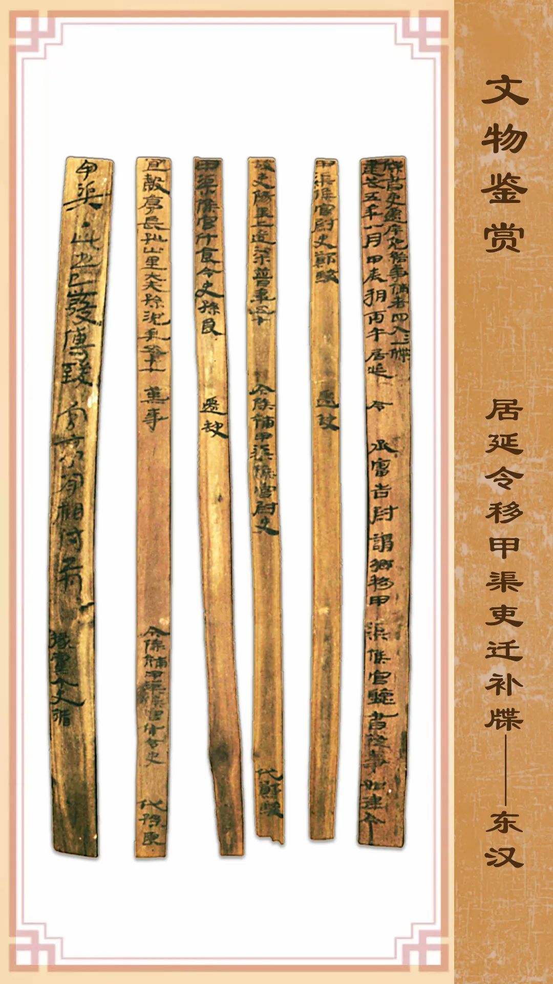 第一簡(jiǎn)文字為:“牒書:吏遷、斥免、給事補(bǔ)者四人,人一牒。建武五年八月甲辰朔丙午,居延令 丞審告尉:謂鄉(xiāng)移甲渠候官,聽書從事,如律令。”這是文件的標(biāo)題和行文要求。“居延令”之后尚留空白,說明這是一份還未正式生效的官員任免文件。其他4簡(jiǎn)則是此次任免人員和崗位的具體內(nèi)容。在簡(jiǎn)牘背面書有此文件的起草人掾黨和令史循二人,屬于共同署名。該文書對(duì)了解漢代基層吏員的任免、除補(bǔ)等基本程式有重要參考價(jià)值?,F(xiàn)藏甘肅簡(jiǎn)牘博物館。