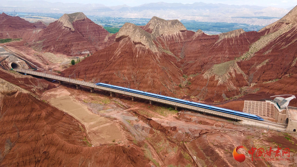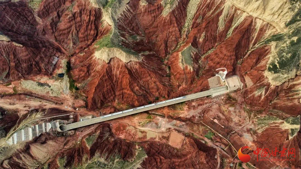 朝家山隧道位于蘭州市紅古區(qū)和青海省民和縣交界處,是蘭新高鐵西出蘭州必經(jīng)之地。在這里,通體呈紅色的丹霞地貌在湛藍(lán)天空下越發(fā)顯得艷麗奪目,列車穿越七彩丹霞,風(fēng)景如畫風(fēng)光無限好。