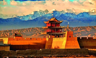 雄關(guān)六百載,長(zhǎng)城越千年。看今朝,戈壁之上,嘉峪關(guān)關(guān)城的朱色城樓與終年皚皚的祁連雪峰交相輝映,歷經(jīng)風(fēng)霜久而彌堅(jiān);峭壁之巔,長(zhǎng)城第一墩矗立于此,腳下流淌的討賴河水澎湃不息;山脊之上,懸壁長(zhǎng)城形似凌空倒掛,氣勢(shì)雄偉。