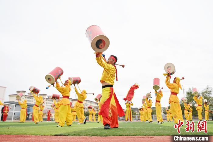 9月9日,甘肅省蘭州市皋蘭縣三川口學(xué)校學(xué)生練習(xí)蘭州太平鼓。近年來(lái),皋蘭縣將國(guó)家級(jí)非物質(zhì)文化遺產(chǎn)蘭州太平鼓納入各中小學(xué)課后服務(wù)內(nèi)容,成立中小學(xué)太平鼓隊(duì)13支,定期邀請(qǐng)非遺傳承人走進(jìn)校園,進(jìn)行傳統(tǒng)文化授課和培訓(xùn),使學(xué)生親身感受中華優(yōu)秀傳統(tǒng)文化的魅力。蘭州太平鼓舞已有六百余年的歷史,素有“天下第一鼓”之稱,2006年被列入中國(guó)第一批非物質(zhì)文化遺產(chǎn)名錄。中新社記者 九美旦增 攝