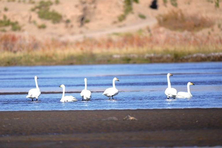 近日,高臺縣黑河濕地多次監(jiān)測到大天鵝種群,它們的翩翩降臨,標志著天鵝一年一度的越冬之旅正式開啟。 大天鵝是雁形目鴨科天鵝屬鳥類,又稱黃嘴天鵝,全身潔白,僅頭稍沾棕黃色;喙黑色,上喙基部黃色,喙端黑色;跗跖、蹼、爪也為黑色,是國家二級保護動物。天鵝對棲息地的選擇極為苛刻,它們的到來是高臺縣黑河濕地生態(tài)環(huán)境質量優(yōu)良的有力證明。