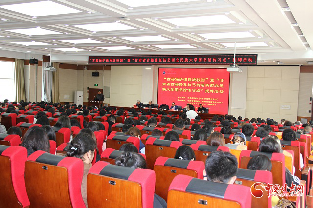 18日下午,由國家圖書館(國家古籍保護(hù)中心)主辦,甘肅省圖書館(甘肅省古籍保護(hù)中心)與西北民族大學(xué)聯(lián)合承辦的“古籍保護(hù)課程進(jìn)校園”活動暨“甘肅省古籍修復(fù)技藝傳習(xí)點(diǎn)”授牌活動在西北民族大學(xué)舉行。