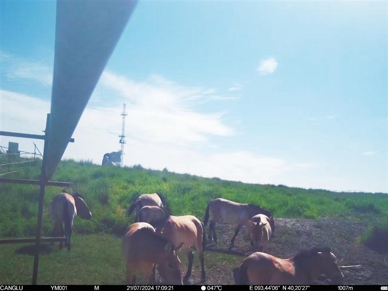 近日,甘肅敦煌西湖國家級自然保護區(qū)管護中心工作人員整理紅外相機拍攝畫面時,發(fā)現(xiàn)拍攝到普氏野馬“哺乳”的清晰影像。畫面拍攝于今年7月下旬,有8匹普氏野馬繁殖群正在馬圈灣濕地的飲水泉附近活動,其中有一匹小馬駒滿足地吸吮著母馬的乳汁。據(jù)監(jiān)測,該小馬駒出生于6月上旬,畫面中約已有一個半月大小,身體健康,毛色光亮。這個繁殖群領(lǐng)地范圍主要從馬圈灣西觀景臺至馬圈灣東高地,該區(qū)域可采食物種類豐富、水源充沛,是適合普氏野馬生活的美麗家園。普氏野馬是國家一級重點保護動物,常棲息于山地、草原和荒漠,性機警、善奔跑。近年來,隨著敦煌西湖保護區(qū)生態(tài)環(huán)境保護力度加大,生態(tài)環(huán)境質(zhì)量持續(xù)改善,群眾保護野生動植物的意識不斷增強,使野生動物活動范圍不斷擴大,種群數(shù)量不斷增加。截至目前,敦煌西湖保護區(qū)內(nèi)普氏野馬種群數(shù)量已達(dá)166匹。