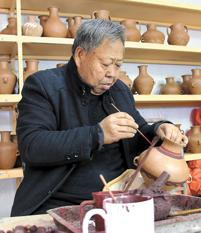 64歲的閻建林(見圖,本報(bào)記者趙帥杰攝)是甘肅省級非物質(zhì)文化遺產(chǎn)項(xiàng)目陶器制作技藝代表性傳承人。走進(jìn)他位于定西市臨洮縣洮陽鎮(zhèn)河口村的家中,院落里、窗臺(tái)上,擺滿了大大小小的陶器,足有上百種。“主要是馬家窯彩陶工藝品,敞口的是盆,帶頸的為罐,耳部安有提手的,還可以稱作壺。”閻建林介紹。