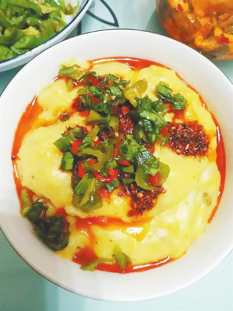 父親吃馓飯,從中間下手。中間吃開,一圈、一圈,只吃到碗邊有薄薄一層,碗底放上酸菜,用筷子輕輕沿著薄如面皮的馓飯邊,剝下來,卷住,夾起,一口吃了,碗里干干凈凈。我一直覺得父親把馓飯吃出了藝術(shù)感,這曾讓我羨慕不已,我試著模仿,但手拙,碗底總剩一點(diǎn)殘?jiān)?。母親和妹妹,就沒有那么細(xì)致,她們從碗邊開始吃起,碗邊涼得快。