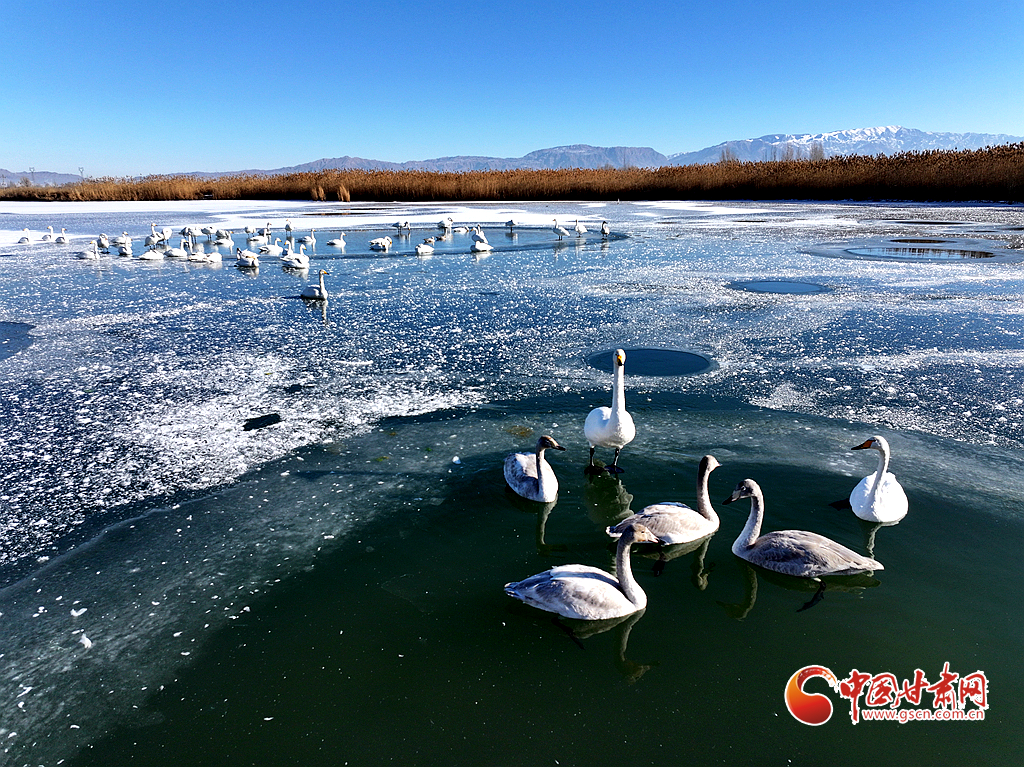 近日,在甘肅省張掖國家濕地公園,成群的越冬天鵝在冰封的湖面上悠然覓食、嬉戲,構(gòu)成了一幅動人的生態(tài)畫卷,成為冬日里一道尤為引人注目的風(fēng)景線。
