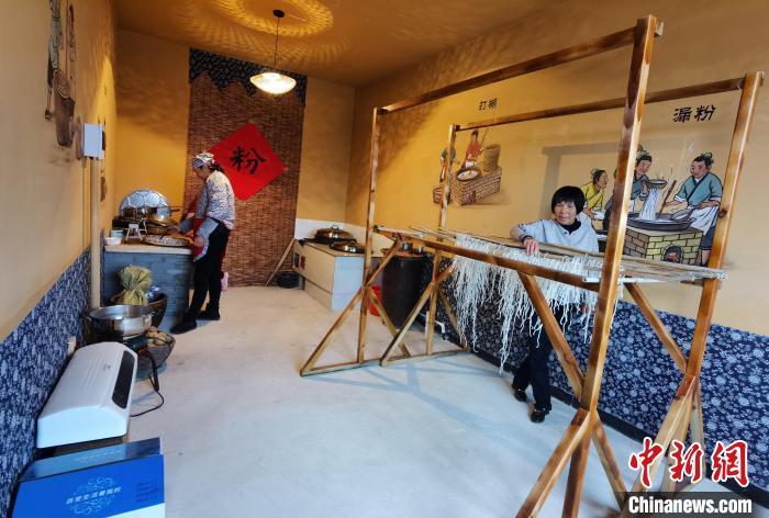 慶陽(yáng)市合水縣太莪鄉(xiāng)黑木村村民在黑木崖生態(tài)康養(yǎng)農(nóng)莊手工作坊晾曬粉條。(資料圖)安志鵬 攝