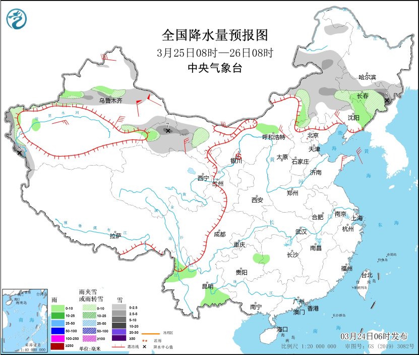 3月25日08時至26日08時,新疆沿天山地區(qū)、內(nèi)蒙古西北部和東部、吉林大部、甘肅河西等地部分地區(qū)有小到中雪或雨夾雪,其中,吉林東部、新疆南疆西部山區(qū)、甘肅北部等地部分地區(qū)有大雪(5~8毫米)。新疆伊犁河谷、內(nèi)蒙古中部、吉林中部、遼寧東部、河北北部、湖南西部、貴州東北部、云南西北部和東南部等地部分地區(qū)有小雨。內(nèi)蒙古中西部、遼寧西部、山東半島、新疆東部、甘肅北部等地部分地區(qū)有4~6級風(fēng),新疆山口地區(qū)陣風(fēng)風(fēng)力8~9級。內(nèi)蒙古中西部、甘肅河西、寧夏等地部分地區(qū)有揚沙。
