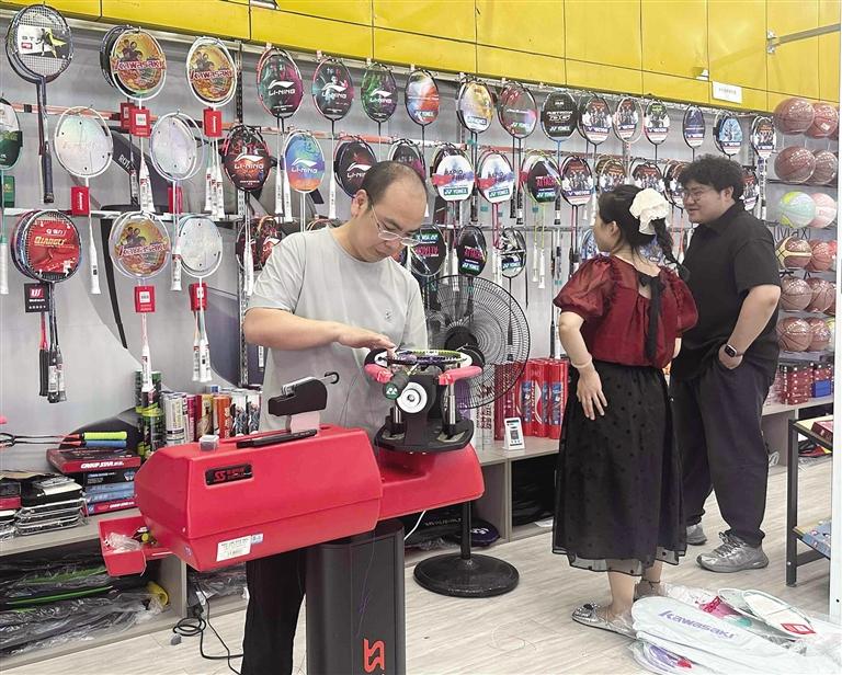 不僅如此,運(yùn)動用品銷售也迎來小高峰。瑞德摩爾太平洋商場內(nèi)的健雄體育用品店內(nèi),老板正忙著給羽毛球空拍穿線。“我們不僅有現(xiàn)成的羽毛球拍,還可以根據(jù)客戶的需求給空拍穿線。”該店老板介紹,羽毛球拍網(wǎng)線價(jià)位30至100元不等,購線還可免手工費(fèi)。羽毛球初學(xué)者一般都會買成品拍自己在家練習(xí),而一些技術(shù)較好的顧客除了會選擇品質(zhì)較好的空拍,還會現(xiàn)場選線拉網(wǎng)定制屬于自己的球拍。“暑假以來,店內(nèi)羽毛球拍銷量大增,穿線需求也逐漸增多,周末從早忙到晚,每半小時(shí)穿一個(gè)球拍,最多一天穿24個(gè),排隊(duì)等候已成常態(tài)。”此外,不少運(yùn)動品牌也順勢推出促銷活動,吸引消費(fèi)者選購。