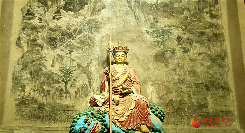 這幅壁畫繪于大佛殿內(nèi)大佛身后墻壁,色彩雖已斑駁,卻仍難掩其藝術(shù)價值,是大佛殿內(nèi)時代較早、藝術(shù)水準(zhǔn)極高的作品。它距地面高1.55米,上下兩端用墨線勾出邊欄,邊欄內(nèi)繪纏枝牡丹點(diǎn)綴;《西游記》故事圖居于正中,殘長約4.4米,殘高約2.9米,面積約12.7平方米,壁畫前今塑有地藏王菩薩像一尊。壁畫由“取水子母河”“道昧放心猿”“大戰(zhàn)紅孩兒”等多個獨(dú)立故事組成,畫面里險山怪石、古木溪水、云霧火海錯落交織,而師徒四人的分工設(shè)定始終清晰:豬八戒挑行李、沙僧牽馬、孫悟空持金箍棒護(hù)送,這份“固定分工”讓豬八戒的勤勞形象貫穿全程。