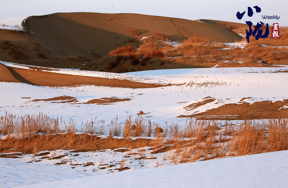 白雪覆蓋著金黃沙丘,而枯黃的蘆葦仍倔強(qiáng)生長(zhǎng)于沙地之間。這不僅是色彩的疊映,更構(gòu)成了一幅堅(jiān)韌的畫(huà)卷:冷與暖、靜與動(dòng),在遼闊的天地間,交織成一篇關(guān)于守望與重生的故事。