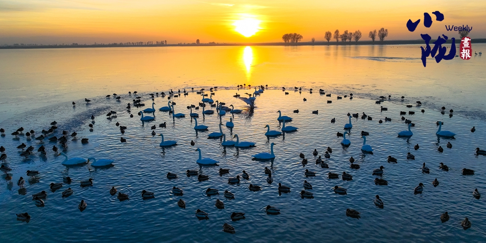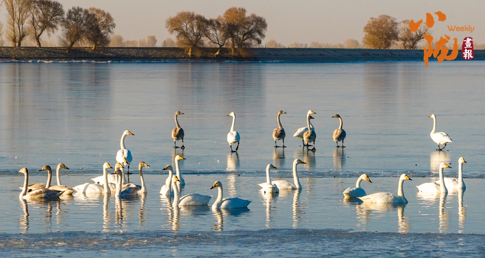 陽(yáng)光斜照,萬(wàn)物生暖。水面上,成群的白天鵝不緊不慢地游著,雪白的身影倒映水中,隨著微波輕輕蕩漾,像是一幅流動(dòng)的水墨畫(huà),素雅而安寧。