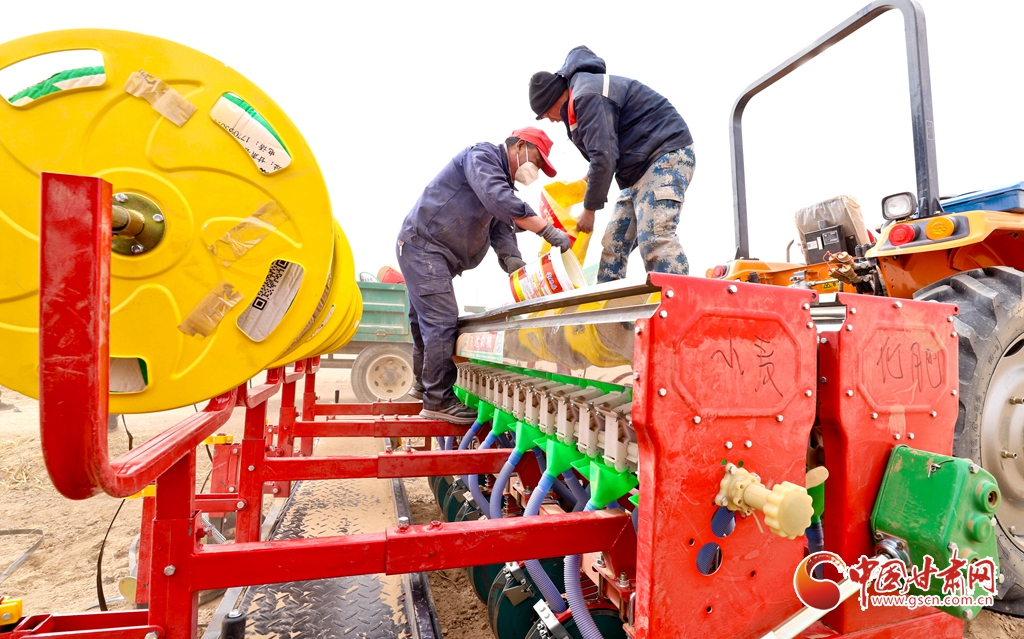 3月12日,張掖市高臺縣巷道鎮(zhèn)殷家橋村綠色高效小麥種植基地上,農(nóng)戶們正在將小麥種子、有機肥料投入播種一體機。