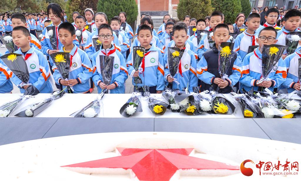 3月30日,高金城烈士紀(jì)念館內(nèi),張掖市甘州區(qū)北街小學(xué)的同學(xué)們向紅西路軍烈士紀(jì)念碑敬獻(xiàn)鮮花。